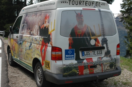 A lefelé vezető úton láttuk a bringás körversenyek ördögét, ill. az autóját.