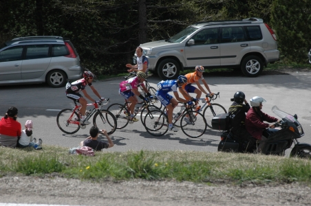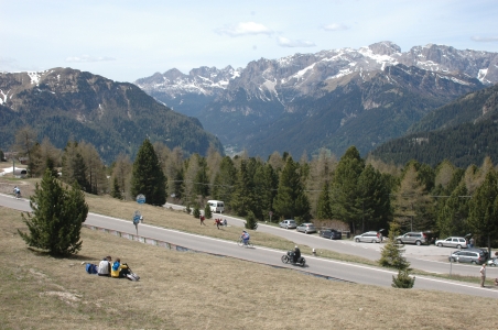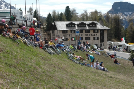 Arabba felöl 9 km a csúcs, tele 180 fokos kanyarokkal, a színtemelkedés 605 méter. Felértünk. :))) A csúcson pihentünk kicsit, a nézők már gyülekeztek, hatalmas volt a felfordulás, zsibongás. A hangulat már 10 órakor a tetőfokon volt.