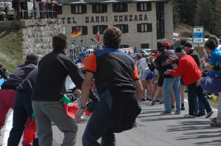 Az út mellett az emberek már elfoglalták a helyüket, a motorosok, autósok, tömegével jöttek felfelé, néha egy-két busz is elhúzott mellettünk. Én ezt a nagy forgalmat nem sokáig bírtam, ezért nem mentünk le egész a hegy aljáig, hanem valahol félúton visszafordultunk. Ez kb. a csúcstól 5-6 km-re lehetett. Igaz, így a Sellára nem másztunk fel, de a Pordoi csúcsáig 3-4-szer feltekertem. :)) Amíg száguldottunk lefelé, kinéztük a szurkoló helyünket a 19. kanyarnál, ami a hegyi hajrától 2 km-re volt.