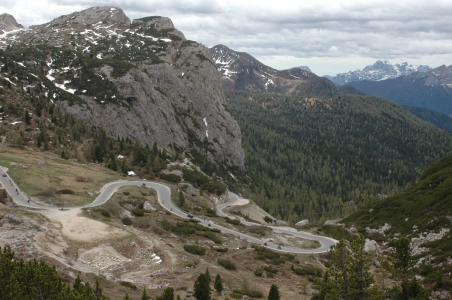 La Villatól számítva másfél óra múlva megint a csúcson voltam Zolival. :))) Fent hideg szél fújt, és komor felhők gyülekeztek. Fotóztunk párat, majd mentünk tovább. A Valparole-ról kb. 2 km-es lejtmenet következett Passo Falzerego-ig. Itt már jártunk egyszer januárban, de nosztalgiából megint megálltunk nézelődni, fotózni. Jó sokat időztünk. Fent motorosok ezrei jöttek-mentek, sok túrista volt. Néhány hűtőmágnes beszerzés után elindultunk lefelé a Falzeregon. A hágó eleje nagyon meredeken kanyargott lefelé.