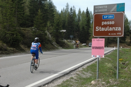 Az igazi mászást Selva di Cadore (1335 m) után, jobban mondva Pescul után kezdtük meg. Januárban Pesculban volt a szállásunk, itt fotóztunk egyet, kicsit nosztalgiáztunk, majd elindult a mászás (salita) Forcella Staulanza (1775 m) szerpentinjén. (Aki ért németül, az ezen az oldalon olvashat Staulanzaról.) Útközben utolértünk két olasz pasit. Az egyik fürgébb lábú volt, ő előre is ment. A másik jött velünk, majd én nem bírtam a tempót, így lemaradtunk. Aztán ő is kifáradhatott, mert útközben többször is megállt. Így hol ő volt előttünk, hol mi előtte. Néhány métert együtt is mentünk. :)))) Fent Staulanzan volt az első etető pont, még minket is megvártak. Arabbaból idáig 1 óra 53 perc alatt értünk.