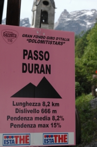 Meg kell jegyezni, hogy a Duranra felvezető emelkedő keményebb volt a Pordoi-ra vagy a Stelviora felvezetőnél. Zoli elmondása szerint a Stelvio csak azért rossz, mert hosszú emelkedő, a meredeksége szinte egyenletes 7%, normális kategóriába tartozik. A Pordoi szintúgy, ott csak az ellenszél nehezíti a feljutást Arabba felöl. A Duran maga a halál. Mászás közben kb. úgy is néztem ki, mint aki halni készül: