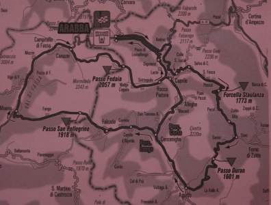 Az Agordoból Arabbaba vezető utolsó 45 km már csak 1300 métert emelkedett. Az itiner szerint először csak 1000 m szintnek látszik, de Rocca Pietore után van benne egy lejtmenet, és utána megint mászás.