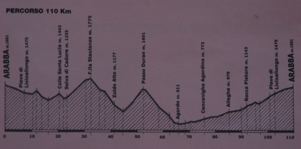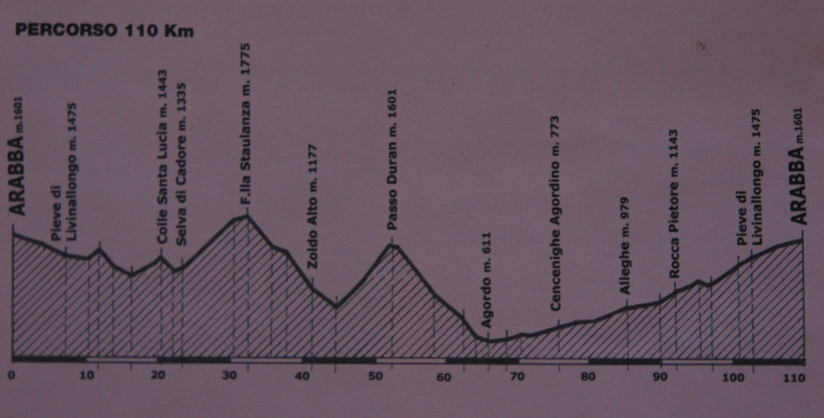 A La gazzetta dello sport 110. éves évfordulója alkalmából rendezett mai verseny két távból állt, az egyik 170 km-es 3500 m szinttel, a másik 110 km 1700 m szinttel. Kiírás Mi a rövidtávon idultunk. Útvonalunk: Arabba-Andraz-Colle S. Lucia-Selva di Cadora-Pescul-Forcella Staulanza-Pecol-Zoldo Alto-Dont-Passo Duran-Agordo-Cencenighe-Alleghe-Caprile-Pieve di Livinallongo-Arabba