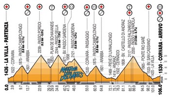 Zoli már árkon-bokron is túlvolt, amikor én felértem a Sellara. Innét újabb zúzás indult lefelé. Az úton több helyen is sárga zászlós emberek integettek, és figyelmeztették a tömeget az út rosszabb minőségére. Mit mondjak, nekem, a magyar utak után fel sem tűnt, hogy itt-ott kátyú van, vagy keresztben be van repedve az aszfalt. Az egyik szakaszon piros zászlós bácsika integetett. Na, mondom magamban, itt biztos útfelbontás, vagy építkezés lehet, vagy tényleg nagyon rossz az út, ha hirtelen megváltozott a zászló színe. Én semmi különösebbet nem vettem észre, csak annyit, hogy 50 m-en kicsivel több keresztrepedés volt az aszfalton. A lejtmenet megint falnak ütközött, elértem a Gardenara felvezető szerpentint. A váltóm kattogott megint egy keveset, majd egy kellemes mászás után felértem újra a csúcsra.